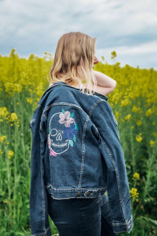 Světle modrá denimová bunda s barevnou výšivkou na zádech. Na přední straně je krásné kontrastní prošití.
