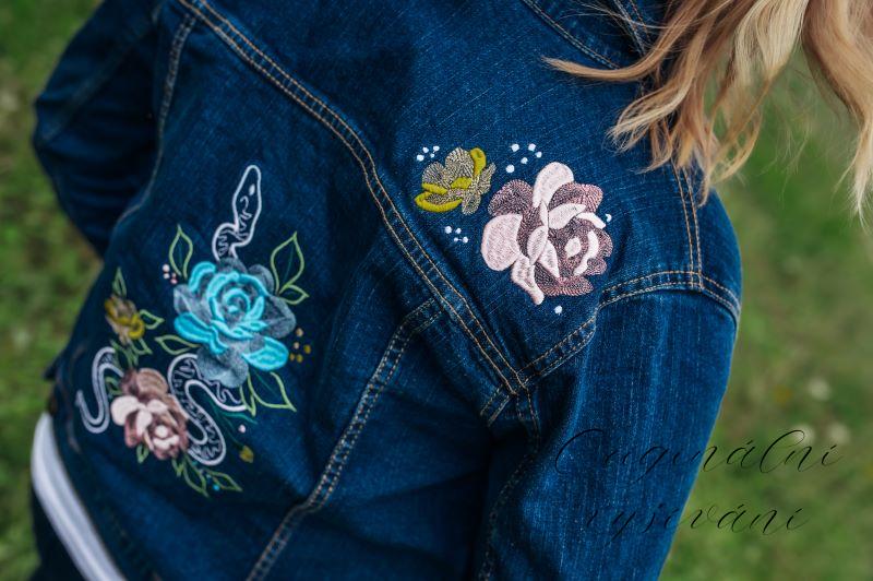 Tmavě modrá denimová bunda s barevnou výšivkou na zádech. Přední část jsem nechala čistou, protože tam najdete krásné kontrastní prošití.